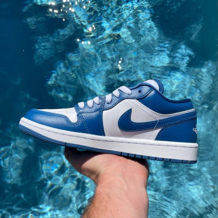 Nike hits again with this clean Jordan 1 Low for the ladies, featuring vivid 'Marina Blue' overlays on a white leather upper.