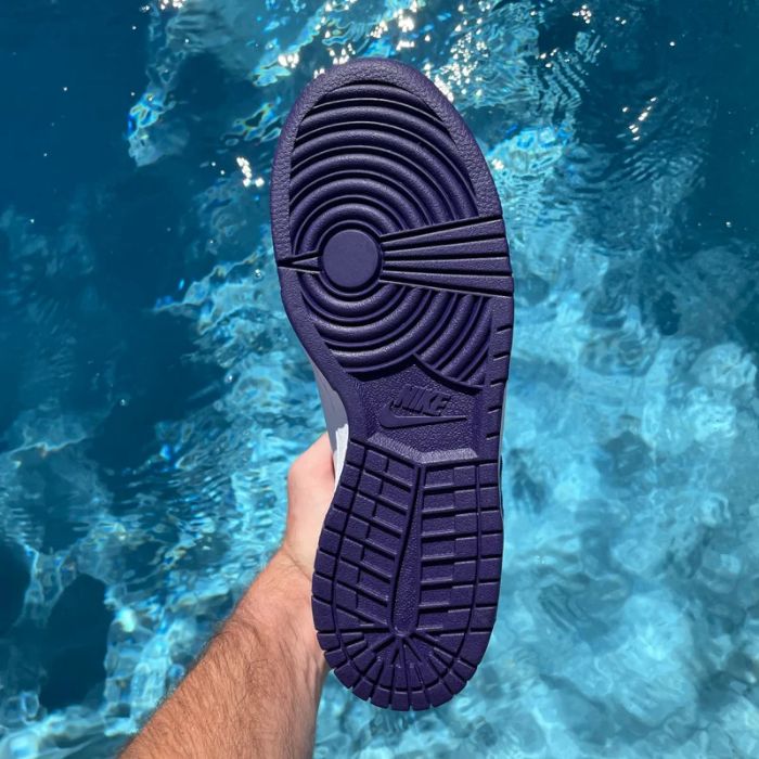 The classic Nike Dunk High silhouette here features dark purple overlays on a white leather upper.